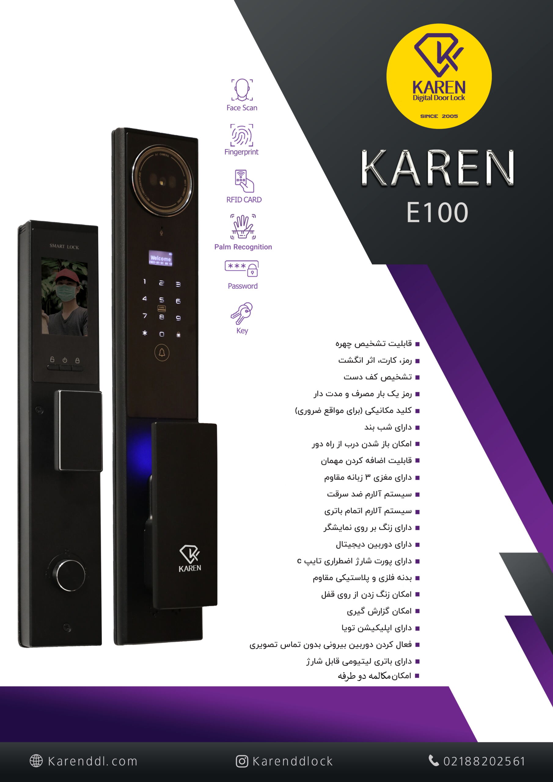 قفل هوشمند کارن E100 انتخابی ایدهآل برای کسانی است که امنیت بالا، کنترل هوشمند و دسترسیهای متنوع را میخواهند. طراحی مقاوم، قابلیت مدیریت بیش از ۵۰۰ کاربر و امکانات بیومتریک پیشرفته، این محصول را برای استفاده خانگی و اداری مناسب میکند.
