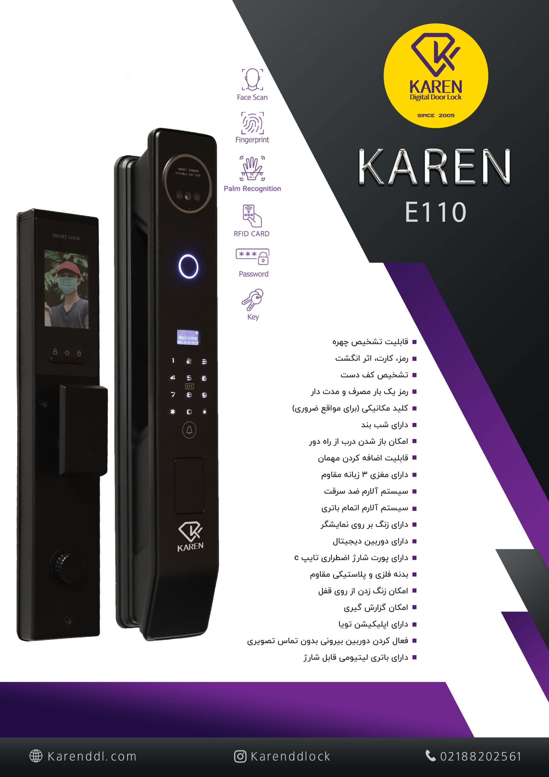 دستگیره دیجیتال کارن E110 ترکیبی از امنیت بالا، کنترل هوشمند و طراحی کاربرپسند است. همه روشهای دسترسی و مدیریت کاربران در یک محصول جمع شدهاند تا خانه یا محل کار شما همیشه امن و راحت باشد.